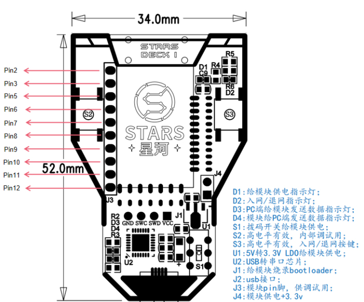 該產品采用郵票孔卡扣設計,便于模塊安裝、卸取,兼具穩定牢固,輕量便攜;電源部分采用5V轉3.3V的USB供電,并配有撥碼供電開關、可接入PC或HUB使用;雙按鍵,輕松實現各類調試,入網、程序測試,燒錄工作。